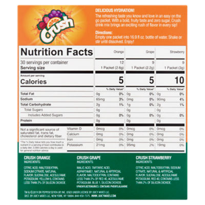 How It Works. Drink Mix Orange Crush 1 packet 5 Calories 2 g 0 g 0 g 0 g 0 mg 0 g 65 mg. Learn the good bad for.